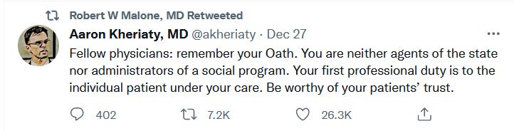 Denying patients treatments that can keep them out of the hospital and may save their lives is unethical and immoral. Especially so when you are pushing a risky new treatment that has very temporary benefits, a horrible short-term safety profile, and unknown long-term risks. The relatively small (but growing) group of doctors who have had the courage to speak out and engage in early treatment deserve our thanks and gratitude. The same goes for those taking a stand against vaccine mandates.